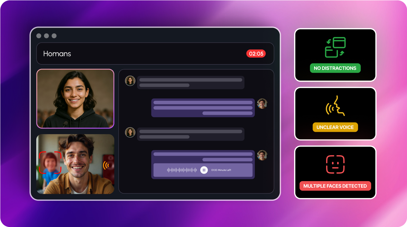 Built-in face match, voice fingerprinting, and screen activity tracking to detect impersonation or cheating in interviews.