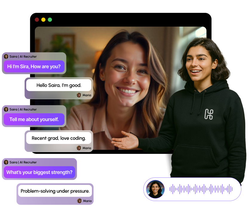 Saira conducts pre-screening interviews via voice and video — assessing communication, tech skills, emotional tone, and body language.